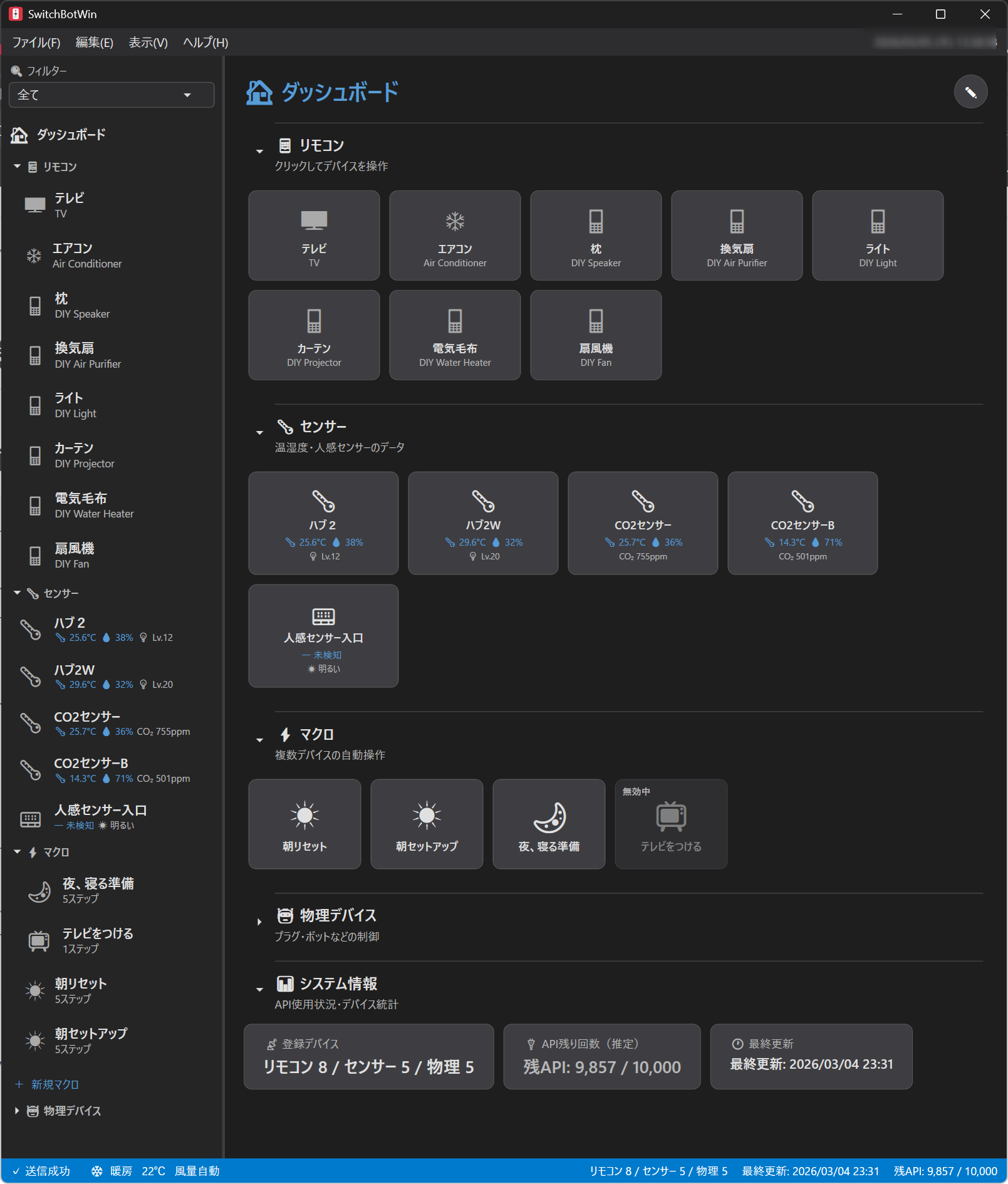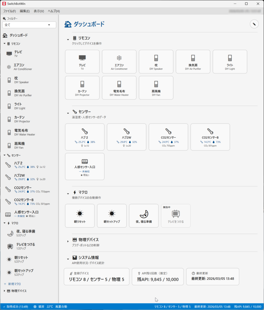 セクション 内容 リモコン 登録済みIRリモコンデバイスのカード一覧 センサー センサーカード(温湿度・CO2・バッテリー等) デバイス 物理デバイス(Bot、カーテン、ロック、プラグ等) マクロ マクロカード(ホバー時に実行/編集ボタン表示) システム 最終更新時刻、API残量、エアコン直近送信状態